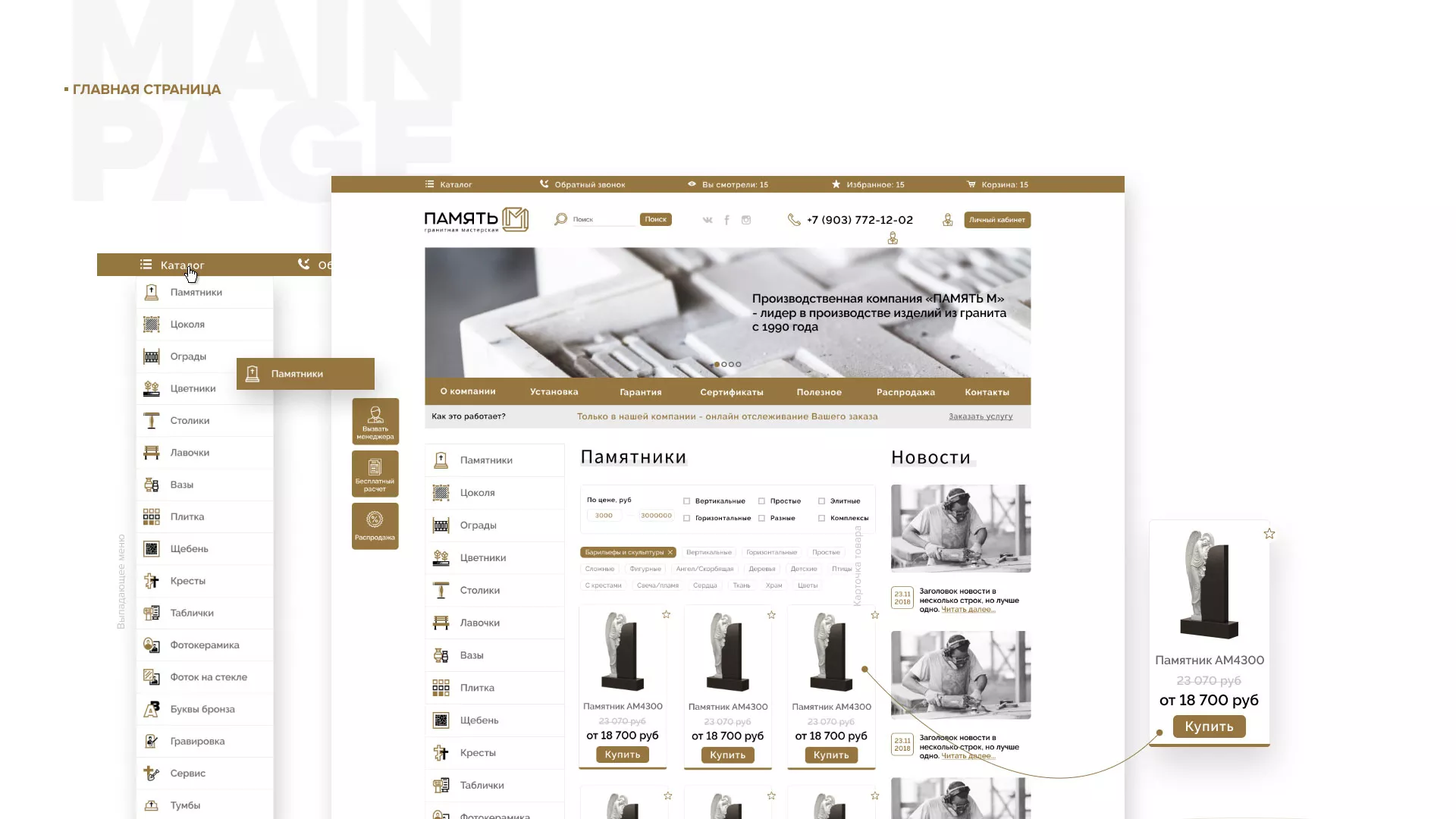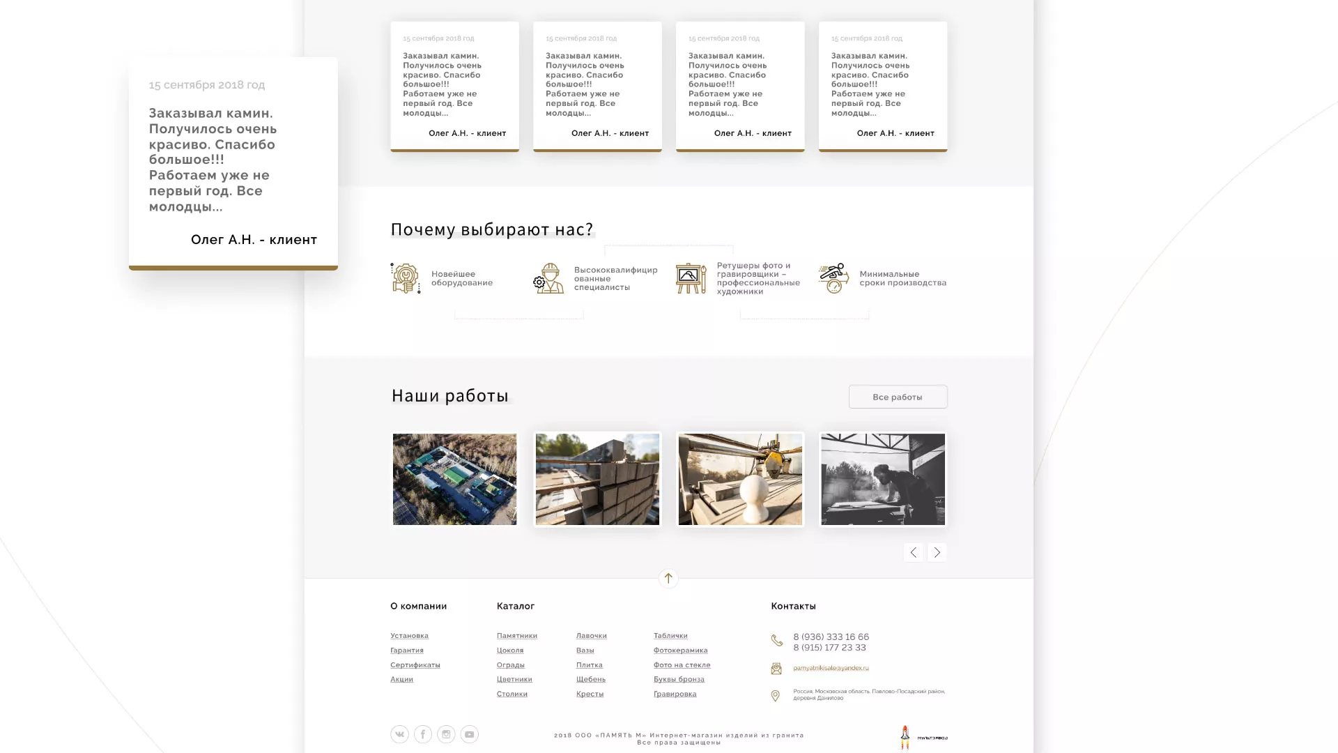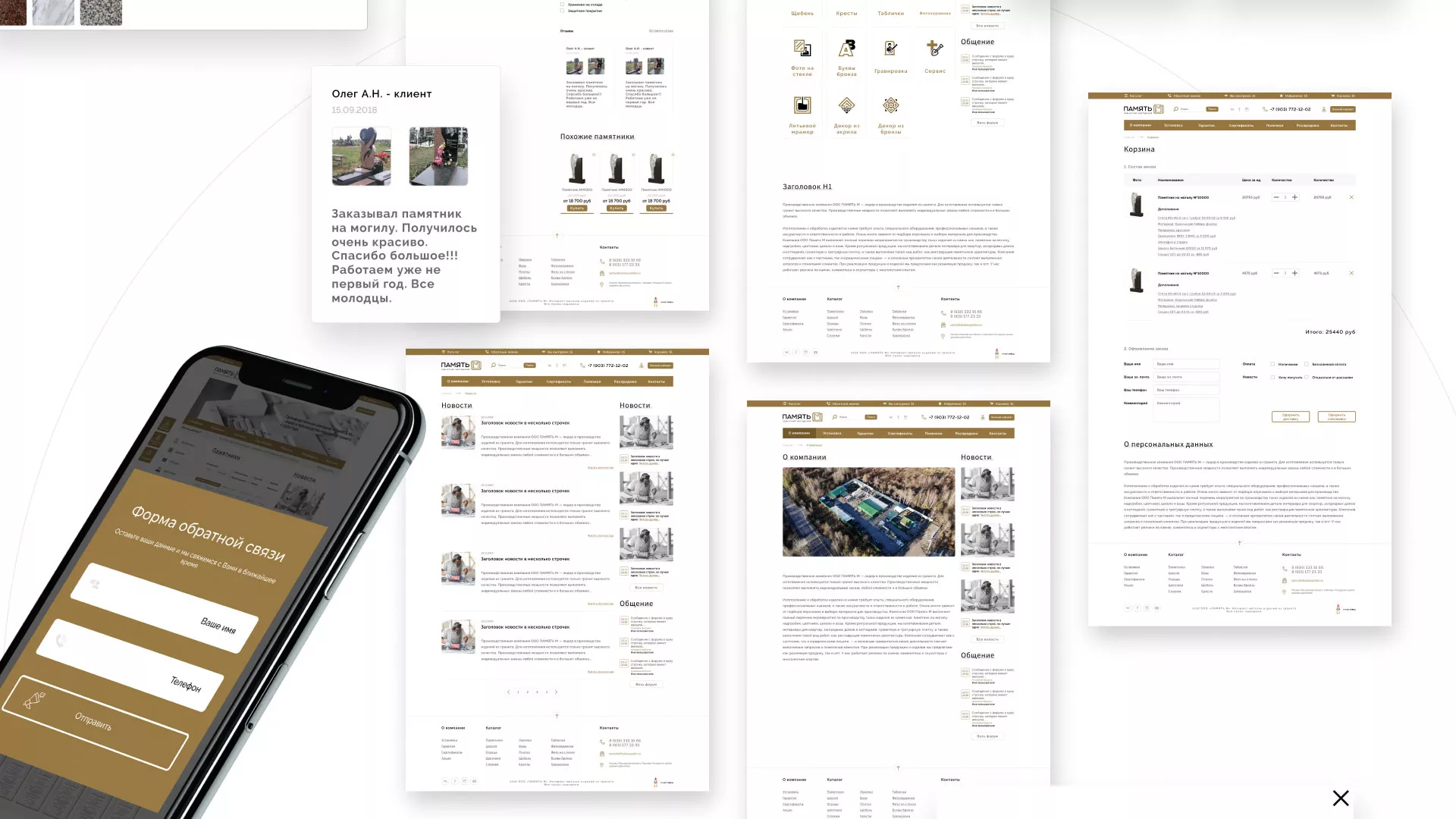 Разработка логотипа, фирменного стиля и сайта в Кандалакше для компании «Память-М». Компания является предприятием по изготовлению всех видов надгробных сооружений: памятников, цоколей на могилу, оградок, столов, лавочек, ваз, балясин, плитки, мемориальных комплексов. Компании «Память-М» изготавливает все виды мемориальных изделий на собственном производстве в Кандалакше.